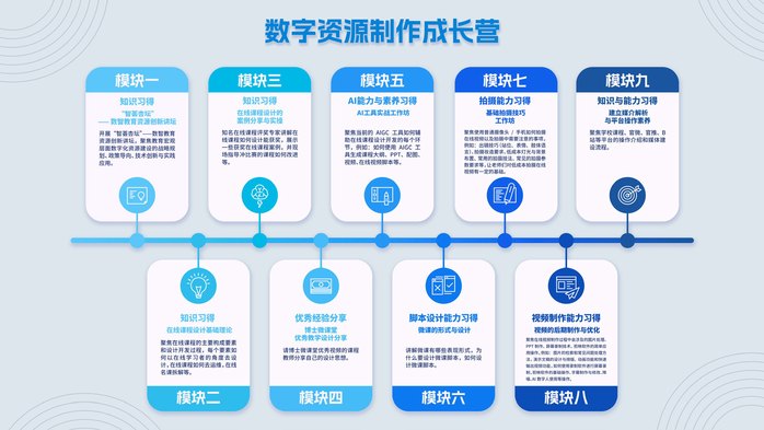 成长营邀请校内外专家授课,内容涵盖教育数字化转型政策解读、在线课程设计原理、微课开发策略等。陈丽教授分析了教育数字化发展趋势;张暾编审分享了课程资源建设经验;王志军教授讲解了智能时代课程设计方法;张一春教授分析了微课制作策略;范宇副教授分享了视频资源开发形式设计。