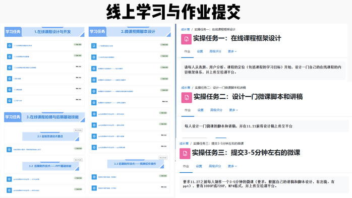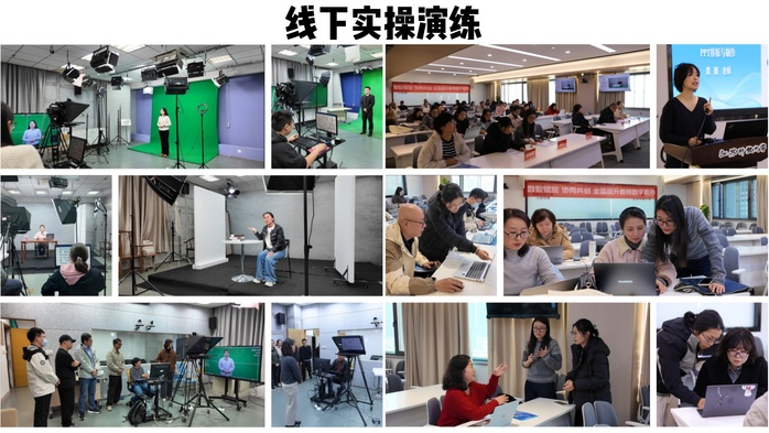 培训采用线上线下结合模式。学员线上学习《在线课程设计》《录课技术》《后期制作》等课程。线下学员分组进行实操演练: